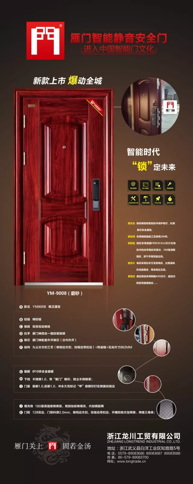 龍川?雁門智能門在不斷發(fā)展的歷程之中,最關(guān)注的莫過于科技創(chuàng)新,深知科技對于品牌的影響力,龍川擁有自己的研發(fā)團(tuán)隊(duì),生物傳感科研所以及智能安防實(shí)驗(yàn)室。現(xiàn)在龍川智能門旗下的產(chǎn)品有“卓越品質(zhì)、綠色環(huán)保、時(shí)尚高雅、創(chuàng)意高效”的特色,擁有多項(xiàng)頂尖功能,還有著遙感技術(shù)、指紋識(shí)別技術(shù)等專利技術(shù)。